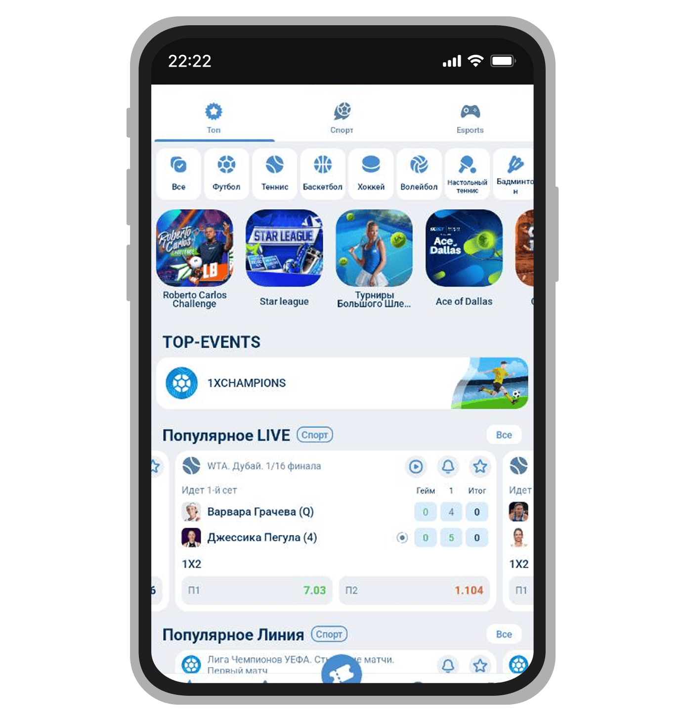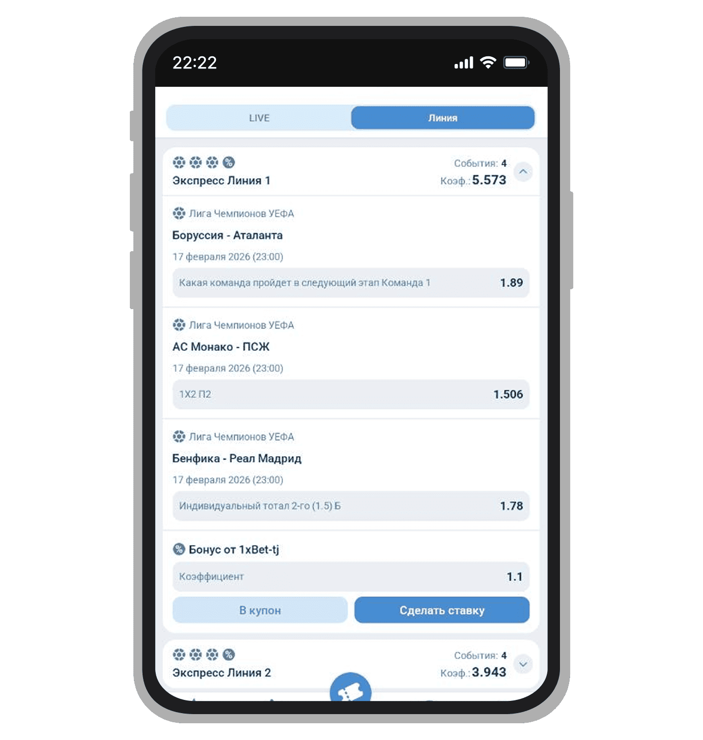 В БК «1хБет ТЧ» линия выкладывается сразу на несколько туров вперёд. Также можно делать долгосрочные ставки на победителей турниров и чемпионатов. На сайте 1xbet.tj для игроков доступны тотализаторы и финансовые ставки.