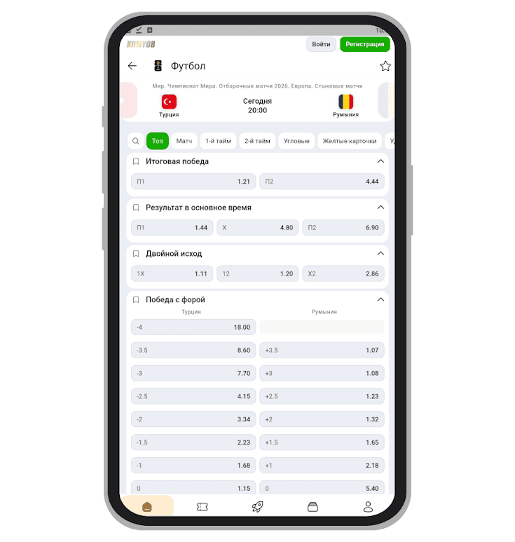 Ставки на спорт онлайн через приложение Komyob оформляются в несколько шагов: